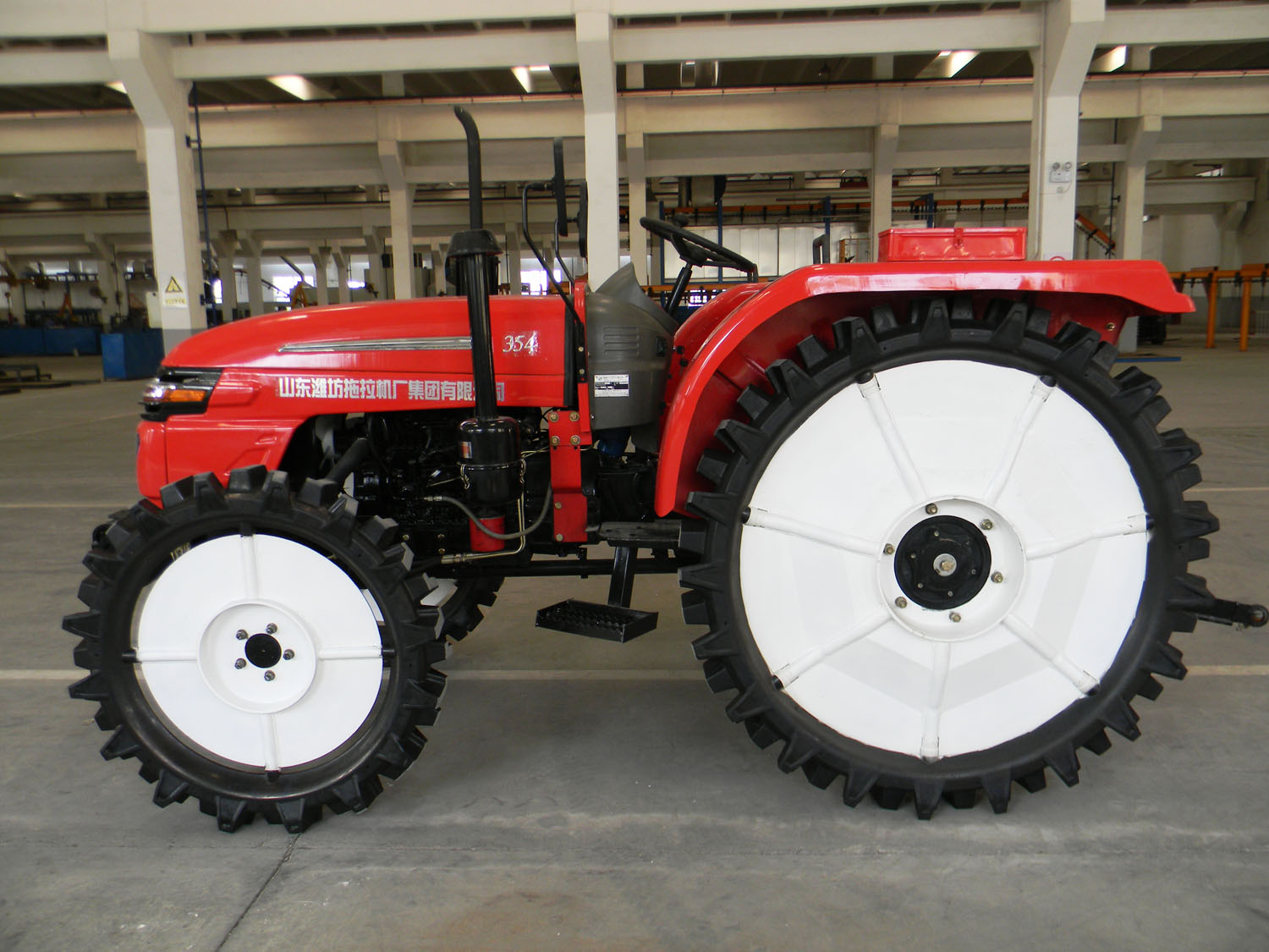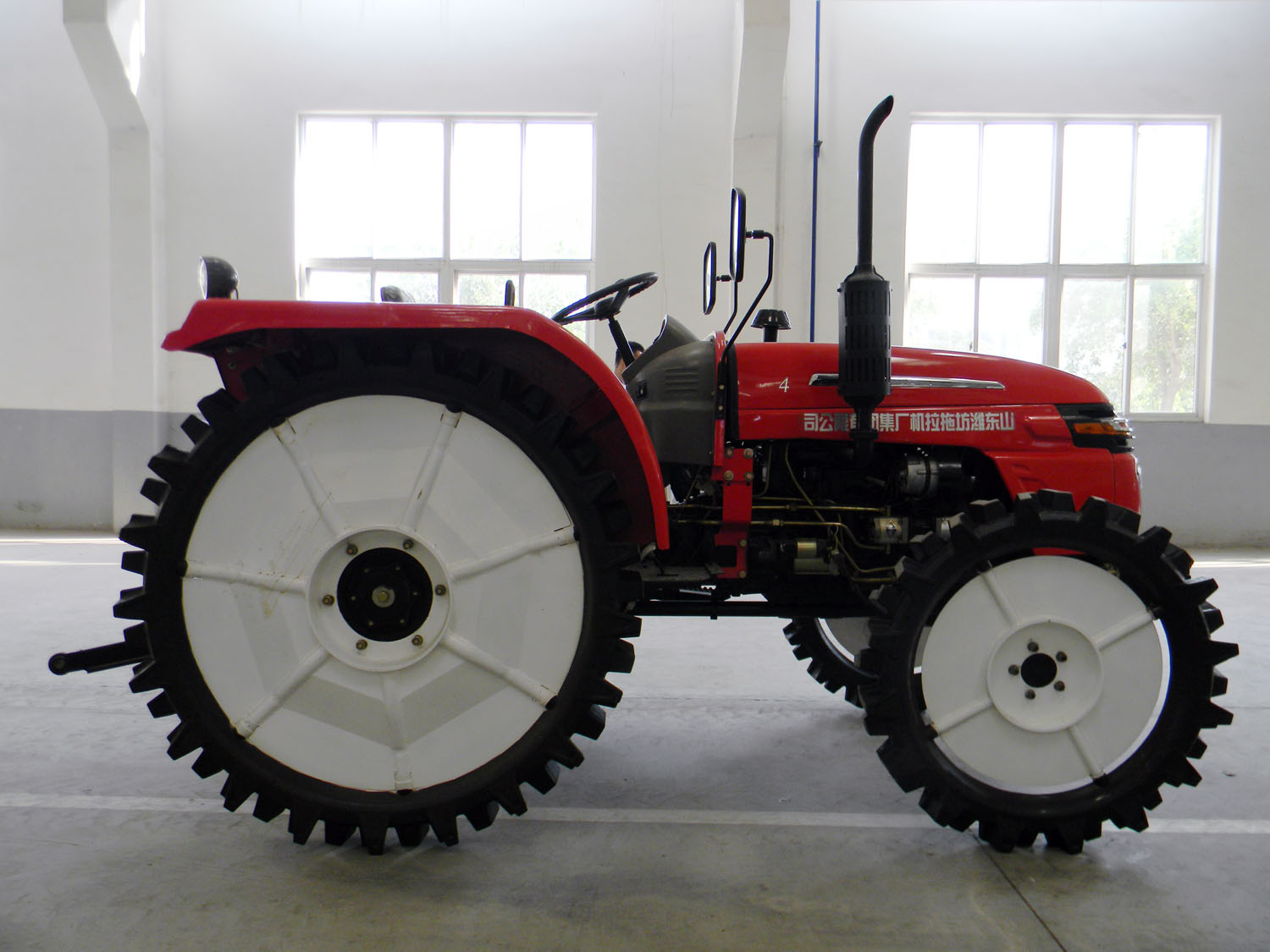 The utility model relates to an agricultural four wheel driving tractor with high clearance in paddy field. The utility model has the advantages of high clearance, large traction force, strong adaptability, flexible operation, easy start and labor saving, convenient use and maintenance, etc. The utility model is provided with a tooth embedded differential lock to improve the pass of the unit. The tractor is fitted with one four cylinder diesel engine, with (2+1)x2 combined gearbox, single stage clutch, multi way valve, air compressor brake, rear PTO, etc.
